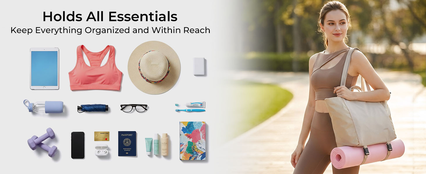 3. 宽敞的8个隔间设计-保持一切井井有条,触手可及:设有宽敞的主隔间,用于放置衣服,杂志和装备,加上7个有组织的功能区,包括:2个内部滑动口袋,1个大拉链内口袋,1个宽敞的iPad隔间(适合11英寸平板电脑),2个侧面水瓶/伞袋,1个后部干/湿分离口袋,用于存放湿毛巾或泳衣。内置可调节的瑜伽垫绑带在基础上安全地保持瑜伽垫或野餐毯。