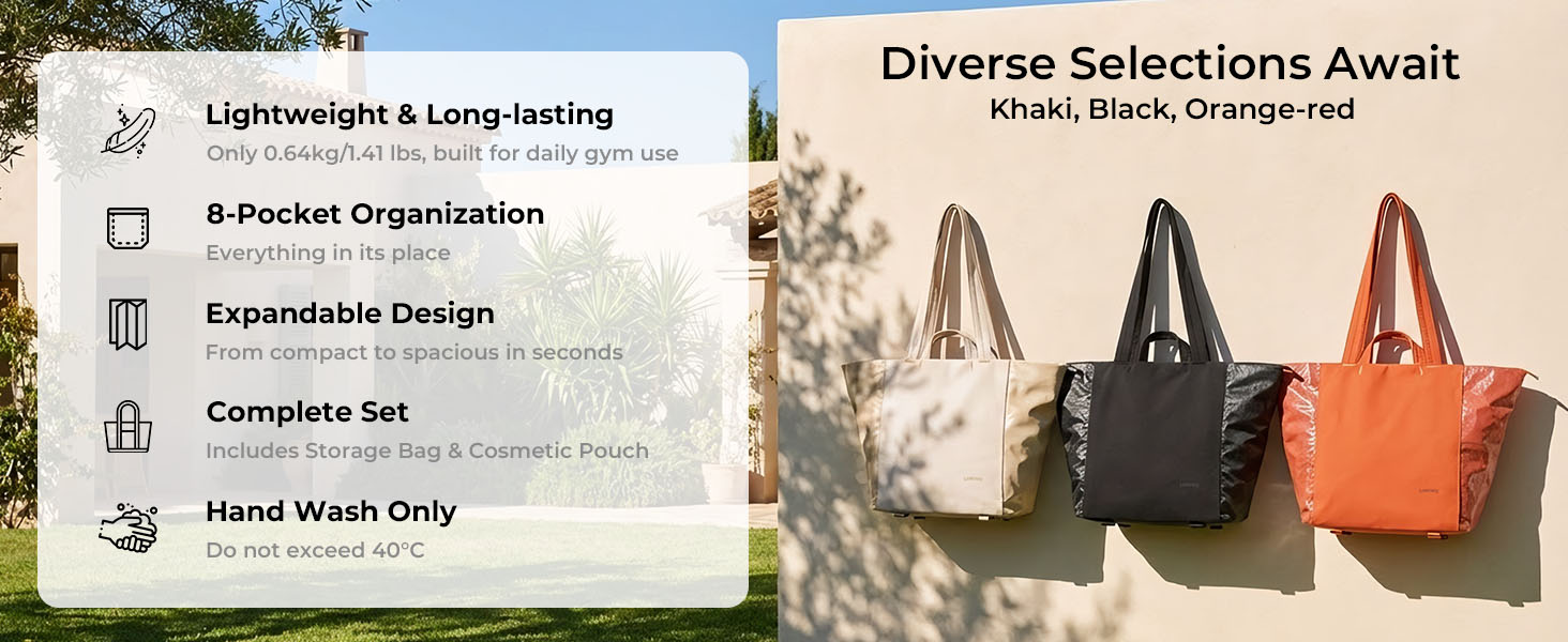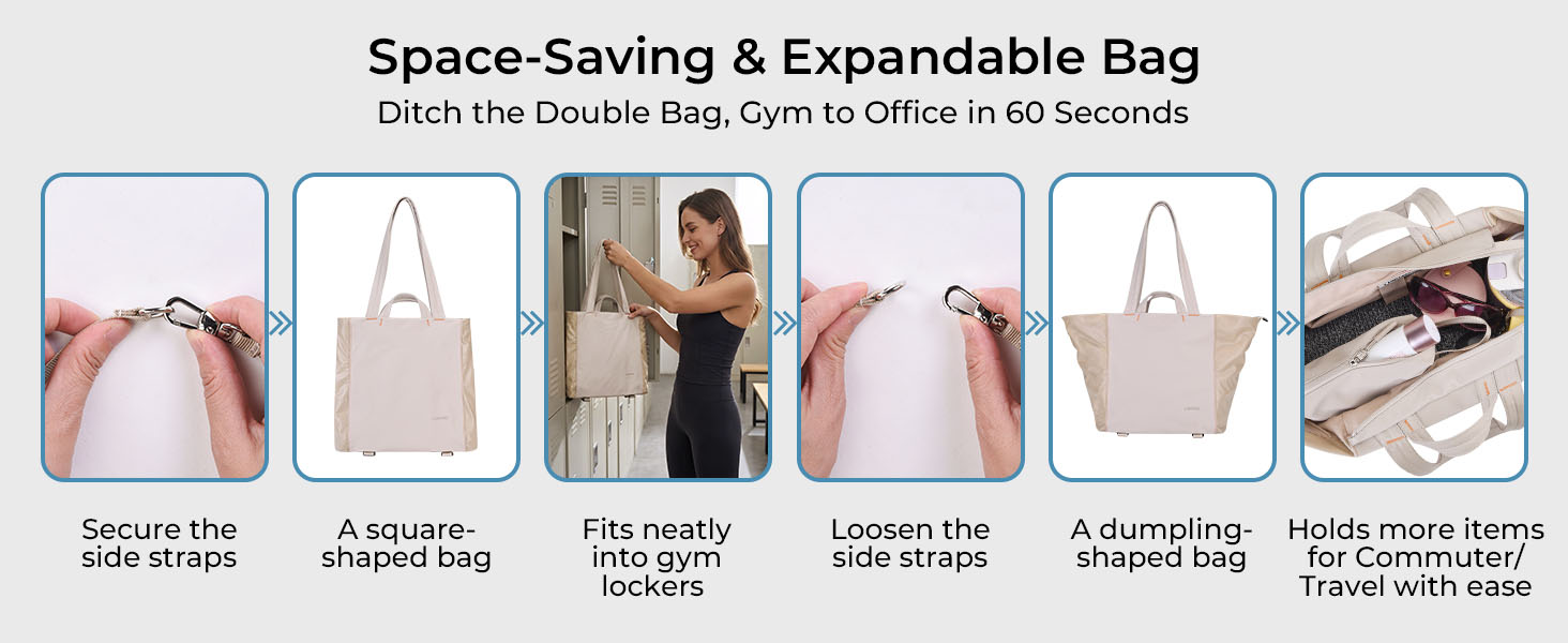 4. 节省空间的可扩展设计-非常适合健身房储物柜和旅行:两个可调节的侧带可以即时转换:收紧压缩成一个紧凑的方形包,可以轻松放入手提箱,健身房储物柜或办公柜;松紧后可以变成一个宽敞的“饺子形”包,可以装很多东西,比如运动装备、工作服和零食。肩带也可兼作钥匙环或小附件钩。